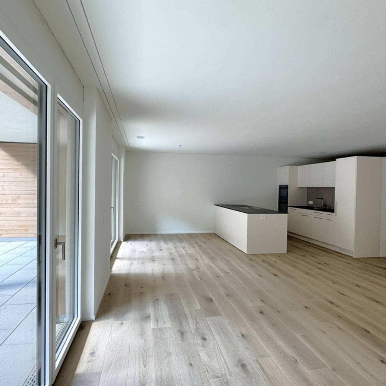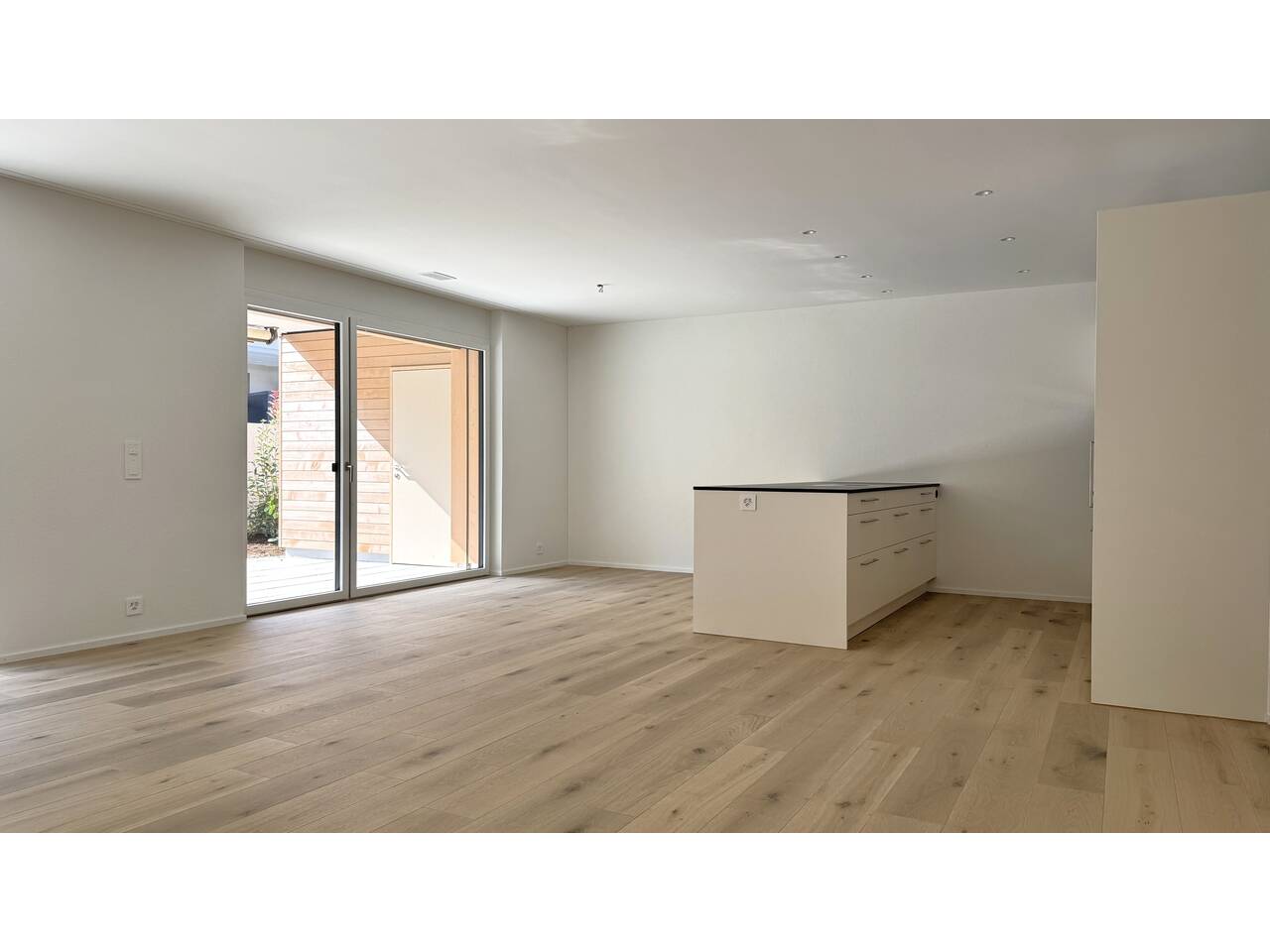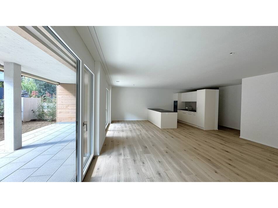 Die familienfreundliche 4.5 Zimmer Gartenwohnung verfügt über 121.60m2 Nettowohnfläche mit zusätzlichem, praktischen Aussenreduit. Der ca. 140m2 grosse Gartenanteil bietet viel Platz für Esstisch, Liegestühle, Outdoor-Grill und/oder Plantschbecken für Kinder. Die Terrasse ist auf einer Fläche von 35m2 überdeckt und verfügt somit über einen optimalen Wetter- und Sonnenschutz. Betritt man das Entrée steht der Familie eine sehr geräumige Garderobe mit viel Stauraum zur Verfügung. Die Wand zur Küche ist im oberen Bereich offen, wodurch das Entrée an Ambiente und Volumen gewinnt. Vom hier gelangt man ins offene Wohnen, welches sich auf einer Fläche von rund 50m2 in zwei Bereiche gliedert. Die Küche zur rechten ist vollausgestattet und bietet mit der über 2.80 Meter langen und freistehenden Kochinsel viel Arbeitsfläche und Stauraum. Der Wohnraum zur linken erlaubt eine individuelle Einrichtung durch die generösen Platzverhältnisse und erschliesst über die bodentiefen Fenster die überdeckte Terrasse. Durch das "Vordach" und die breiten Sonnenstoren ist die Terrasse gut vor Hitze und Sonne geschützt und lädt zum Verweilen im Aussenbereich ein. Das praktische, hinter der Küche angesiedelte Reduit, bietet zusätzlich Stauraum und ist mit einem Waschturm ausgestattet. Das Elternschlafzimmer bildet einen Rückzugsort mit Tageslicht Bad "En Suite" und hervorragenden Platzverhältnissen. Die zwei Kinderzimmer sind mit knapp 14.0m2 identisch gross und ermöglichen über bodentiefe Fenster den direkten Zugang zum Garten. Diese eignen sich gleichermassen als Kinderzimmer oder Büro.