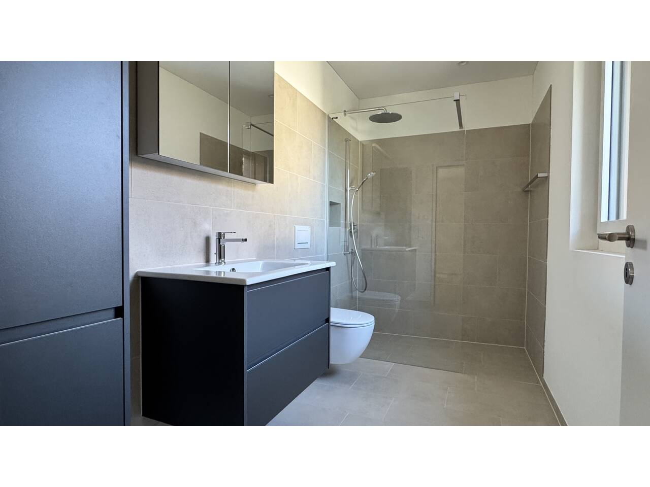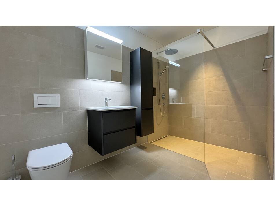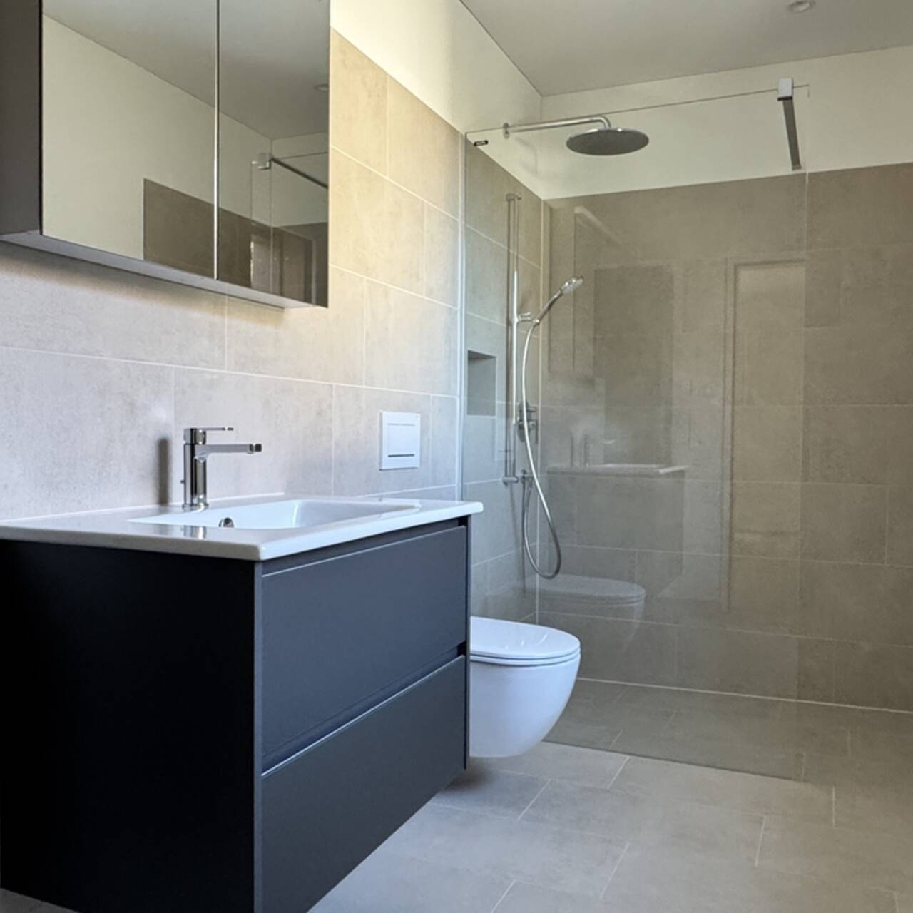 Beide Nasszellen sind identisch und sehr hochwertig materialisiert. Die Farbgebung der Fliesen in Ergänzung zur Anthraziten Möblierung verleihen den Nasszellen eine moderne Erscheinung und dennoch warmes Ambiente. Diese verfügen über eine überdurchschnittliche Ausstattung mit Unterbaumöblierung der Waschtische, sehr praktischen Hoch- und dimmbaren Spiegelschränken. Es gibt pro Badezimmer eine begehbaren Regenduschen mit Produkte-Nischen und das Elternbad verfügt über ein Fenster und somit über Tageslicht.