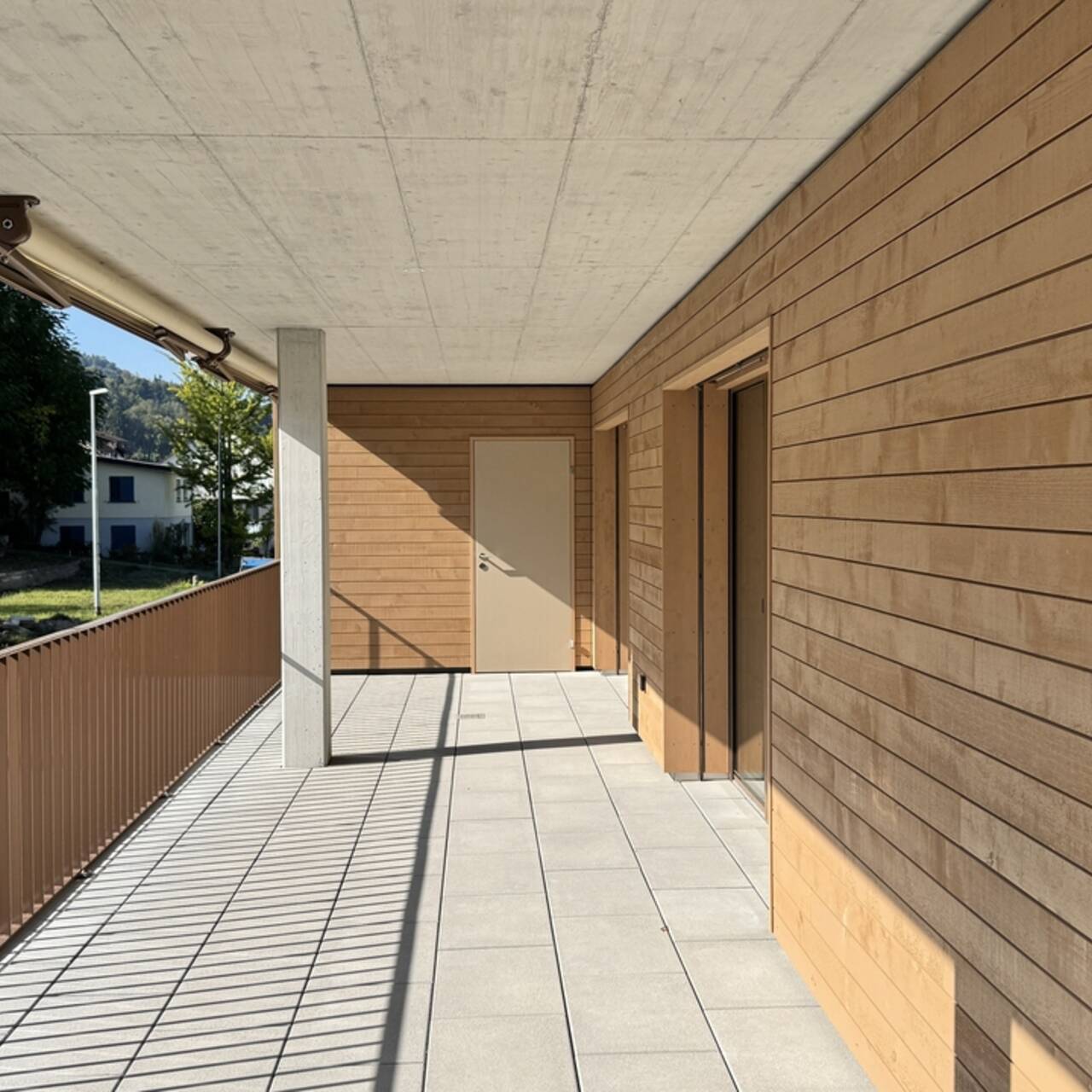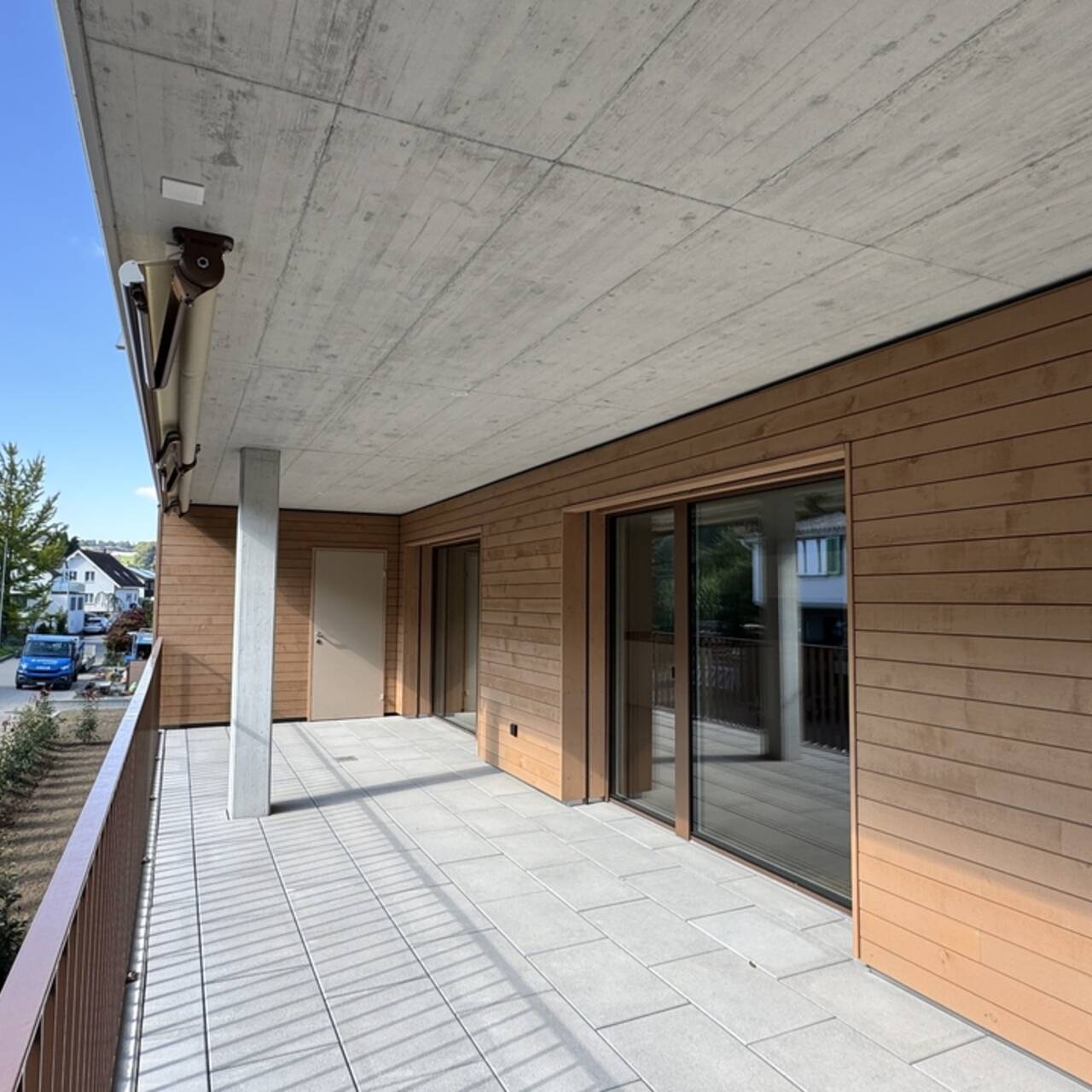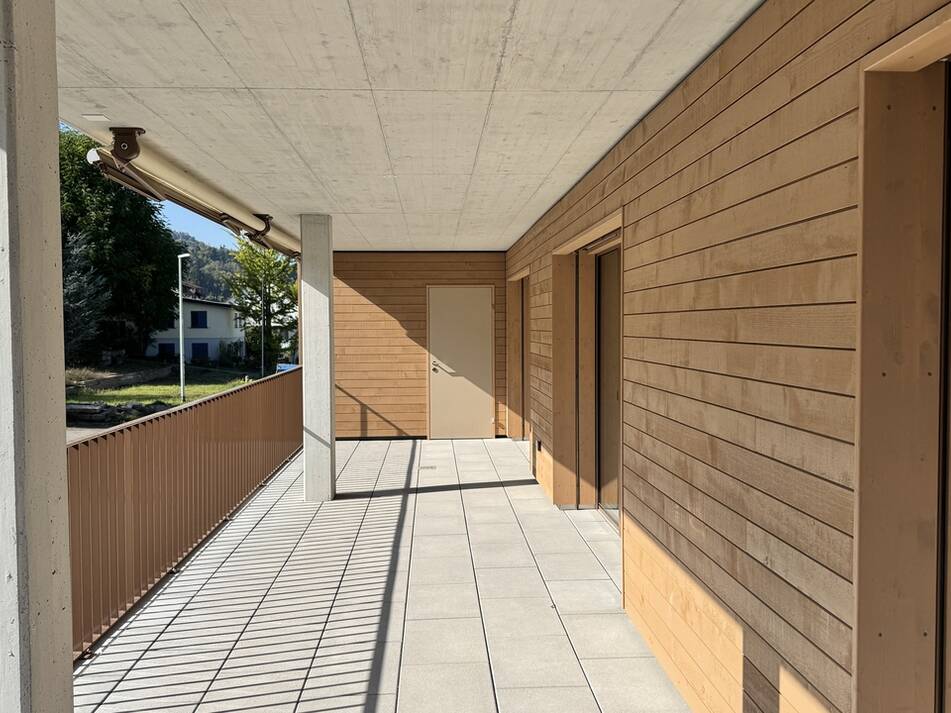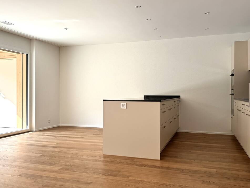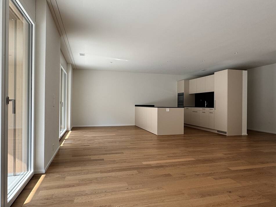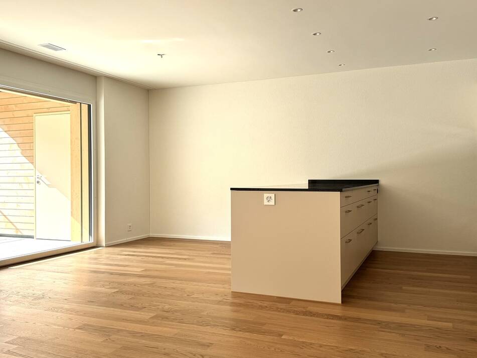 Die familienfreundliche 4.5 Zimmer Etagenwohnung verfügt über 121.60m2 Nettowohnfläche mit zusätzlichem, praktischen Aussenreduit. Die riesige Terrasse ist 35m2 gross und vollumfänglich überdeckt und bietet somit einen optimalen Wetter- und Sonnenschutz wird. Betritt man das Entrée steht der Familie eine sehr geräumige Garderobe mit viel Stauraum zur Verfügung. Die Wand zur Küche ist im oberen Bereich offen, wodurch das Entrée an Ambiente und Volumen gewinnt. Vom hier gelangt man ins offene Wohnen, welches sich auf einer Fläche von rund 50m2 in zwei Bereiche gliedert. Die Küche zur rechten ist vollausgestattet und bietet mit der über 2.80 Meter langen und freistehenden Kochinsel viel Arbeitsfläche und Stauraum. Der Wohnraum zur linken erlaubt eine individuelle Einrichtung durch die generösen Platzverhältnisse und erschliesst über die bodentiefen Fenster die überdeckte Terrasse. Durch das "Vordach" und die breiten Sonnenstoren ist die Terrasse gut vor Hitze und Sonne geschützt und lädt zum Verweilen im Aussenbereich ein. Das praktische, hinter der Küche angesiedelte Reduit, bietet Stauraum und ist mit einem Waschturm ausgestattet. Das Elternschlafzimmer bildet einen Rückzugsort mit Tageslicht Bad "En Suite" und hervorragenden Platzverhältnissen. Die zwei Kinderzimmer sind mit knapp 14.0m2 identisch gross und eignen sich gleichermassen als Kinderzimmer oder Büro.