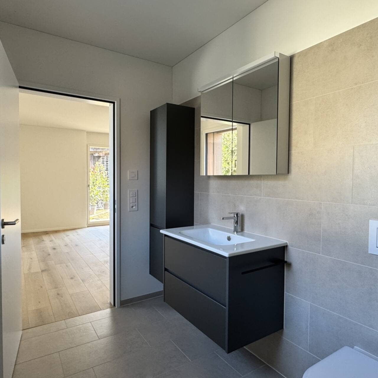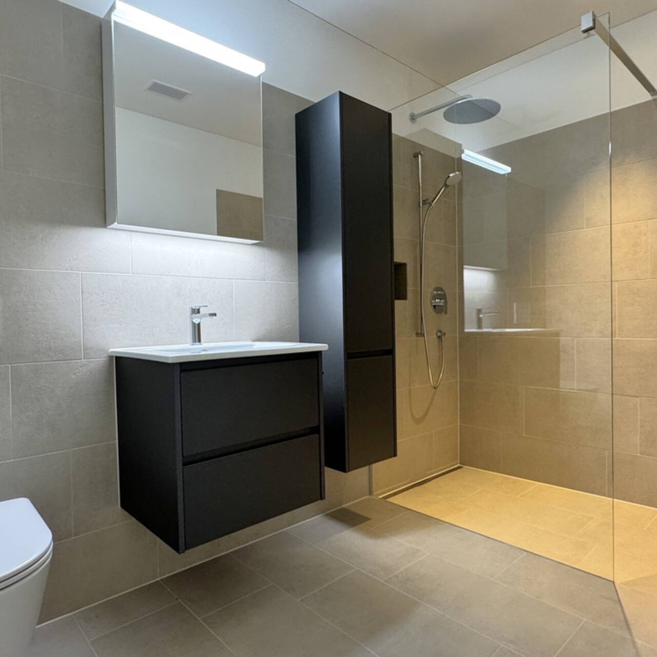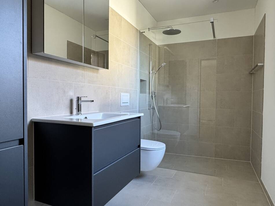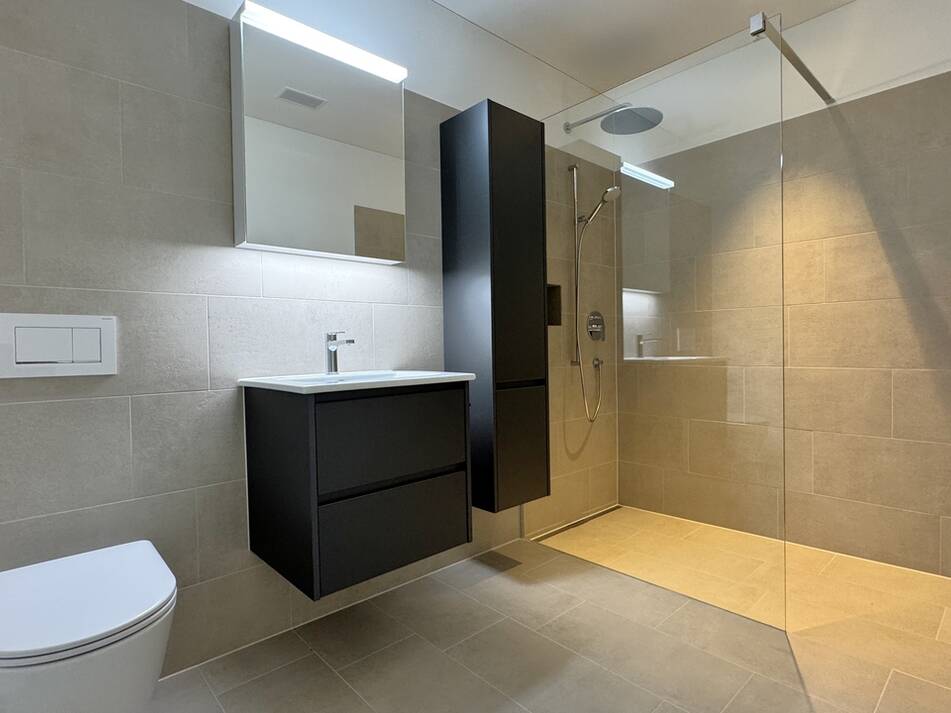 Beide Nasszellen sind identisch und sehr hochwertig materialisiert. Die Farbgebung der Fliesen in Ergänzung zur Anthraziten Möblierung verleihen den Nasszellen eine moderne Erscheinung und dennoch warmes Ambiente. Diese verfügen über eine überdurchschnittliche Ausstattung mit Unterbaumöblierung der Waschtische, sehr praktischen Hoch- und dimmbaren Spiegelschränken. Es gibt pro Badezimmer eine begehbaren Regenduschen mit Produkte-Nischen und das Elternbad verfügt über ein Fenster und somit über Tageslicht.