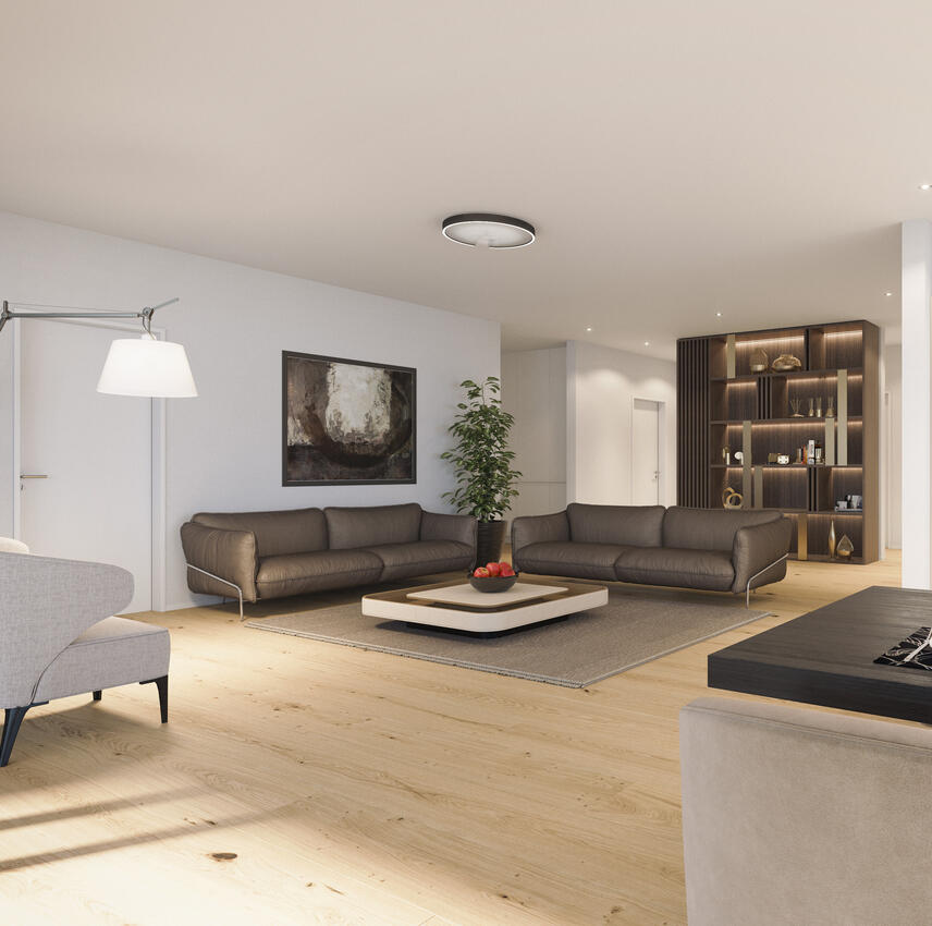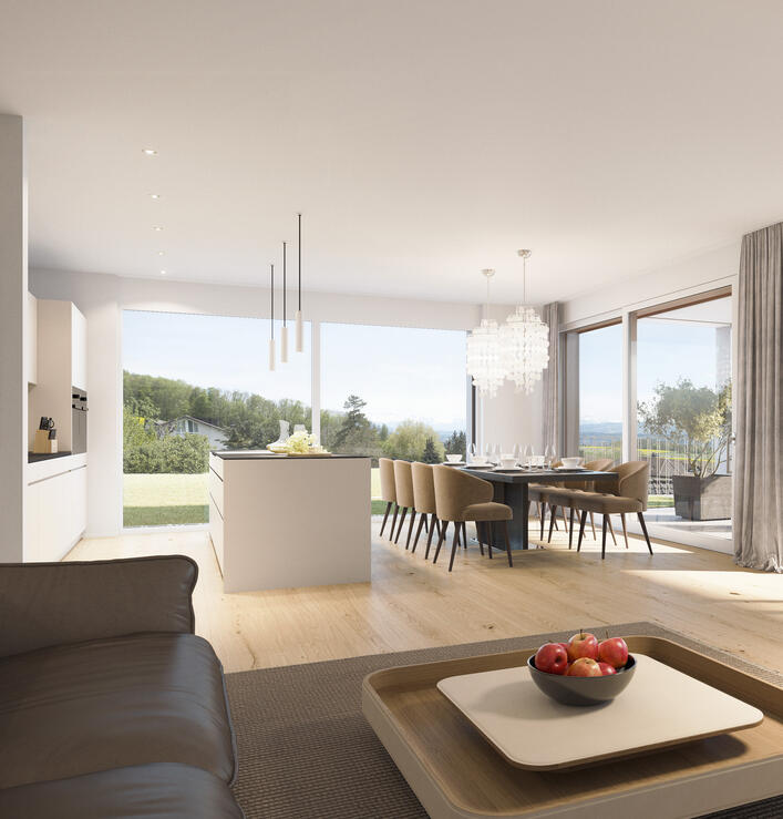 Der Wohn-Essbereich wird umsäumt von breiten Hebeschiebetüren womit die Aussicht beim Kochen, Essen oder Wohnen allgegenwertig ist und den Aussenbereich variabel erschliesst. Die Küche ist sehr gross konzipiert und bereits im Standard hochwertig materialisiert. Das Design der Küche definiert sich durch die grifflosen und pflegeleichten Oberflächen in der Top Ausführung «Fenix soft Touch» und Schrankmodulen des premium Herstellers Stöcklin. Das Budget beinhaltet Top-Line Geräte der Hersteller MIELE und V-ZUG sowie keramische Arbeitsflächen und grosser Kochinsel. Das Wohnzimmer bildet einen zentralen Aufenthaltsbereich zu welchem sich die offene und dennoch seitlich abgegrenzte Küche gesellt und den Aussenbereich in das Wohnkonzept integriert. Der Elterntrakt liegt ebenfalls im vorderen, südwestlichen Bereich womit sich dieser von den Kinderzimmern abgrenzt und den Zugang zur Sonnenterrasse ermöglicht. Das Konzept lässt viele Einrichtungsvarianten zu und ergänzt den Schlafraum mit einem Tageslicht Bad "En Suite". Die Ausstattung und das Budget der Nasszellen kann als ausserordentlich bezeichnet werden und bietet Armaturen von Gessi, Waschtische mit Aufsatzbecken und Unterputzarmaturen sowie stufenlos begehbare Regenduschen.