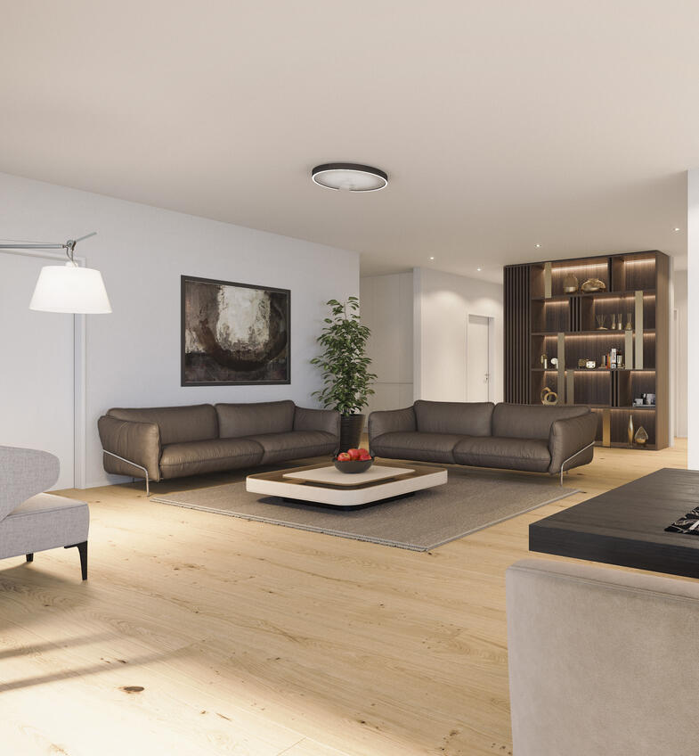 Der Wohn-Essbereich wird umsäumt von breiten Hebeschiebetüren womit die Aussicht beim Kochen, Essen oder Wohnen allgegenwertig ist und den Aussenbereich variabel erschliesst. Die Küche ist sehr gross konzipiert und bereits im Standard hochwertig materialisiert. Das Design der Küche definiert sich durch die grifflosen und pflegeleichten Oberflächen in der Top Ausführung «Fenix soft Touch» und Schrankmodulen des premium Herstellers Stöcklin. Das Budget beinhaltet Top-Line Geräte der Hersteller MIELE und V-ZUG sowie keramische Arbeitsflächen und grosser Kochinsel. Das Wohnzimmer bildet einen zentralen Aufenthaltsbereich zu welchem sich die offene und dennoch seitlich abgegrenzte Küche gesellt und den Aussenbereich in das Wohnkonzept integriert. Der Elterntrakt liegt ebenfalls im vorderen, südwestlichen Bereich womit sich dieser von den Kinderzimmern abgrenzt und den Zugang zur Sonnenterrasse ermöglicht. Das Konzept lässt viele Einrichtungsvarianten zu und ergänzt den Schlafraum mit einem Tageslicht Bad "En Suite". Die Ausstattung und das Budget der Nasszellen kann als ausserordentlich bezeichnet werden und bietet Armaturen von Gessi, Waschtische mit Aufsatzbecken und Unterputzarmaturen sowie stufenlos begehbare Regenduschen.