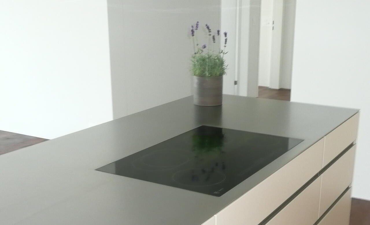 Die helle, hochwertige und moderne Küche mit Kochinsel, grifflosen Fronten und Chromstahlabdeckung setzt einen Kontrapunkt zum traditionellen Holzboden. Der so entstanden Kontrast lässt viel Spielraum bei der Einrichtung und der persönlichen Note.